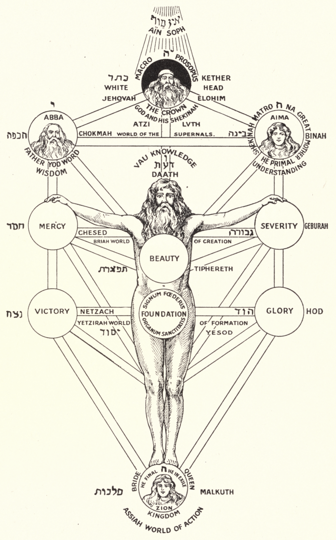 Remember our discussion of the Sephiroth tree a while back [see the illustration below]? The rabbis had/have this idea of a tree with the ‘ayn soph’ – ‘the One who is unknowable’ or, literally, ‘without end’ – above it, energizing it and directing it. The Sephiroth tree is an attempt to understand and explain Yah Elohim in his various aspects or emanations. In the Sephiroth, these emanations are in groups of 3 and on 3 levels between the Kingdom on earth and the ayn soph. Paul makes a reference to the center level of this Sephiroth tree when he says, “Behold the goodness and the severity of Elohim”. Superimposed on the tree is a representation of a man standing on the earthly Kingdom (Yah’s Bride, the earth is his footstool, Is.66.1) with his arms outstretched, his right hand (Yah’s grace) resting on the emanation of mercy/goodness and his left hand (Yah’s justice) resting on the emanation of his severity/judgment. (It looks kind of like a man crucified on a tree.)